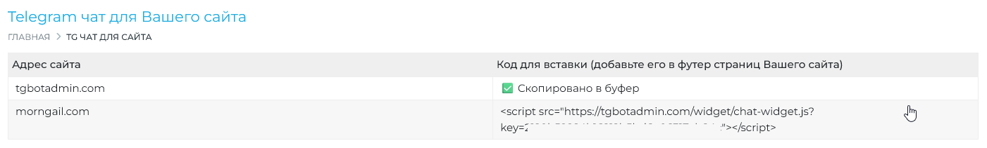 После этого появится табличка, где напротив домена Вашего сайта будет код для вставки на страницы Вашего сайта