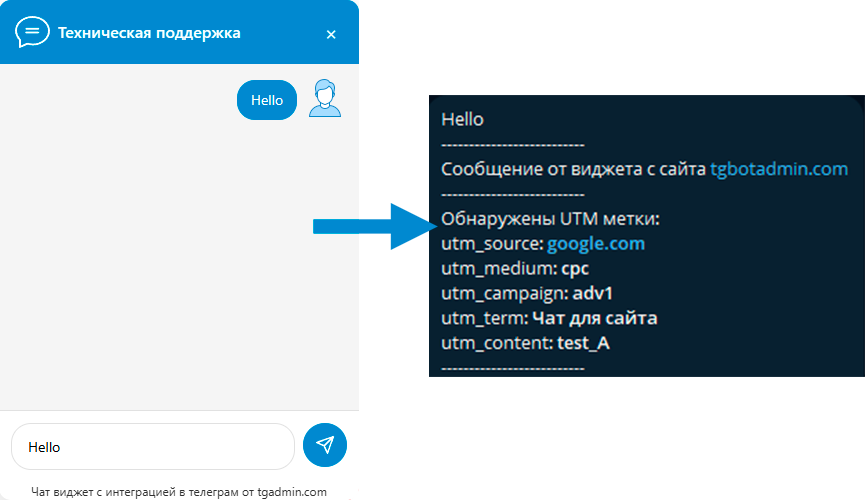 Если есть UTM метки, скрипт сохранит их содержимое и передаст с сообщением от пользователя.