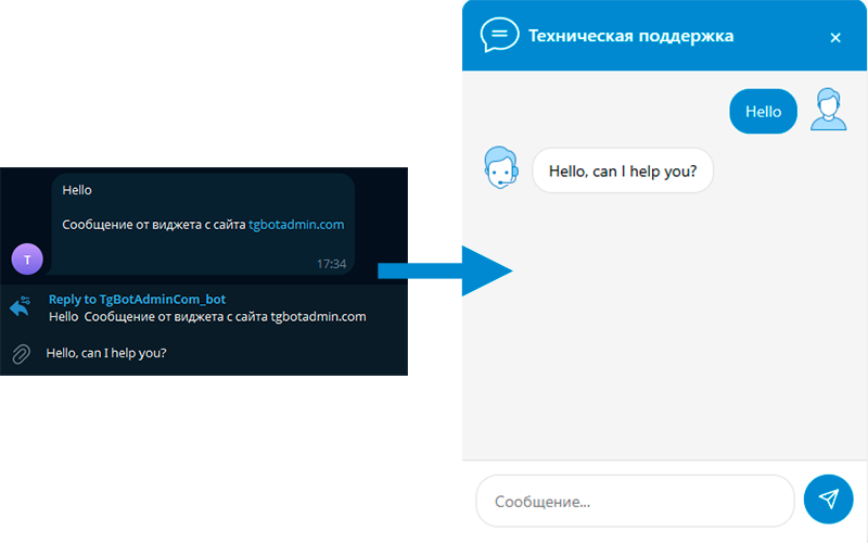 При ответе из Telegram чата на это сообщение пользователя сайта моментально получит его в виджете чата на сайте.